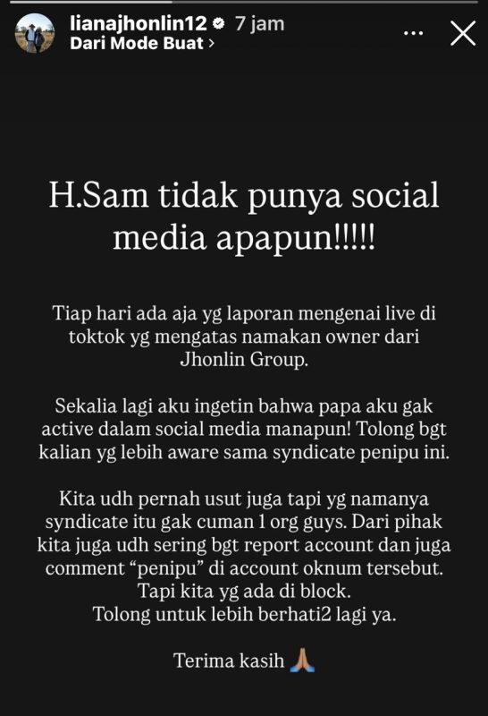 Menanggapi hal tersebut, putrinya, Liana Saputri, memberikan imbauan tegas melalui akun Instagram pribadinya, @lianajhonlin12, agar masyarakat tidak tertipu oleh oknum yang memanfaatkan nama ayahnya.